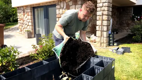 Pro stavění zvýšeného záhonu není potřeba žádné nářadí. Kostky jednoduše zacvaknete do sebe.