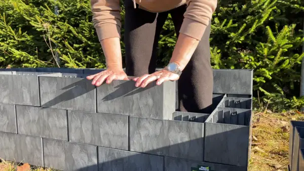 Hledala jsem něco, z čeho vyvýšený záhon postavit, aby to zvládla i ženská. Stavebnice Flexi Element se mi zdála jednoduchá na manipulaci. Tak jsem se do toho postila sama. Stačilo mi jedno odpoledne a bylo hotovo. Kostky se do sebe pěkně zacvakávaly. Záhon je dost vysoký, abych se nemusela ohýbat při vytrhávání plevele a tak jsem ho pro jistotu uprostřed svázala drátem na vázání plotů. Stačilo provrtat do kostek díry a protáhnout drát a stáhnout. Mám tak větší jistotu, že se záhon nerozjede.