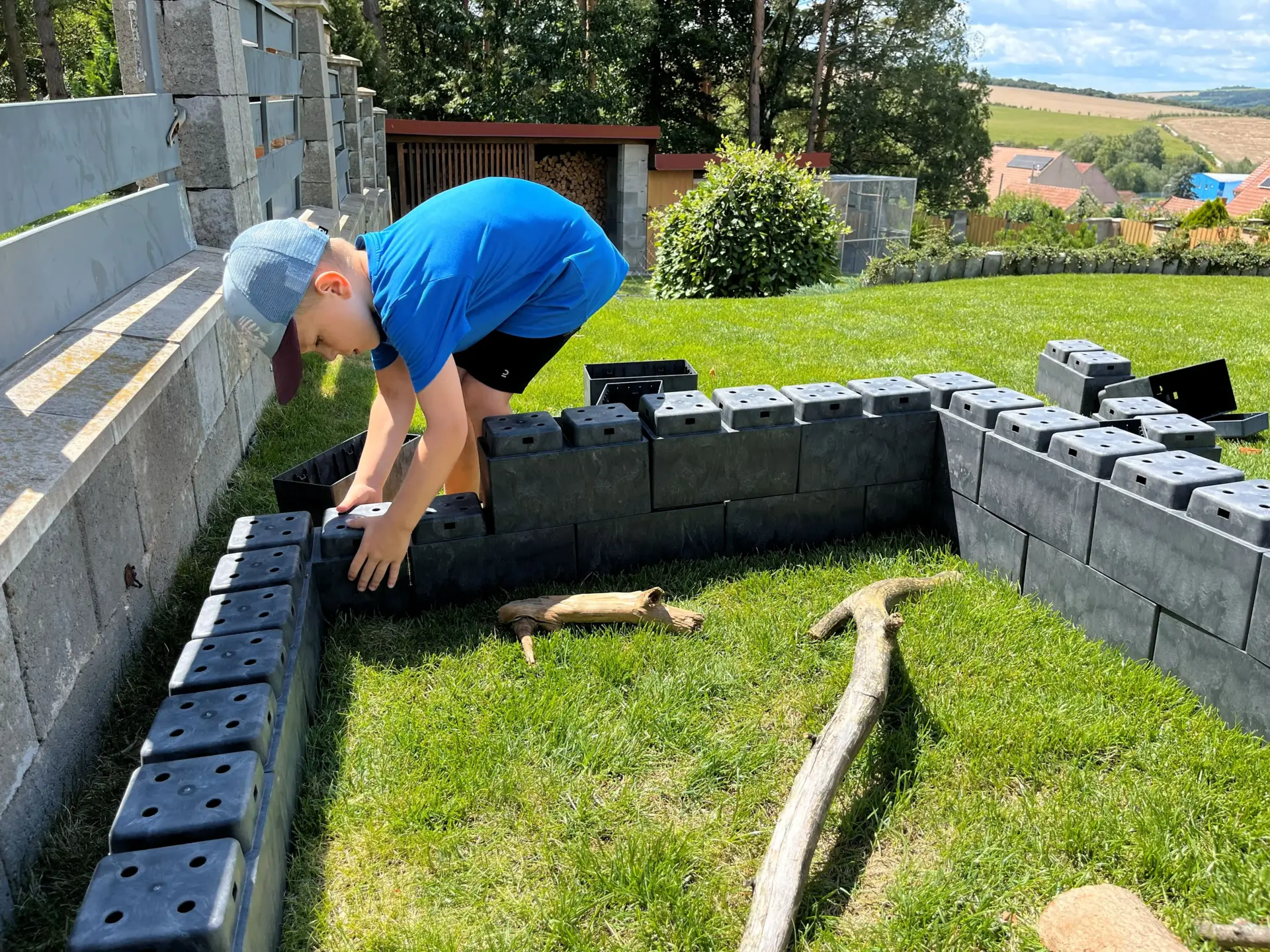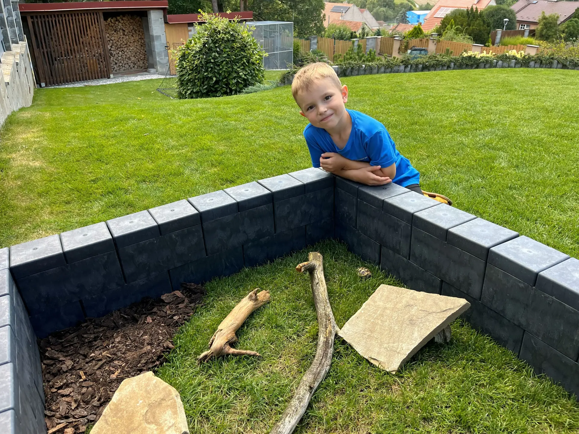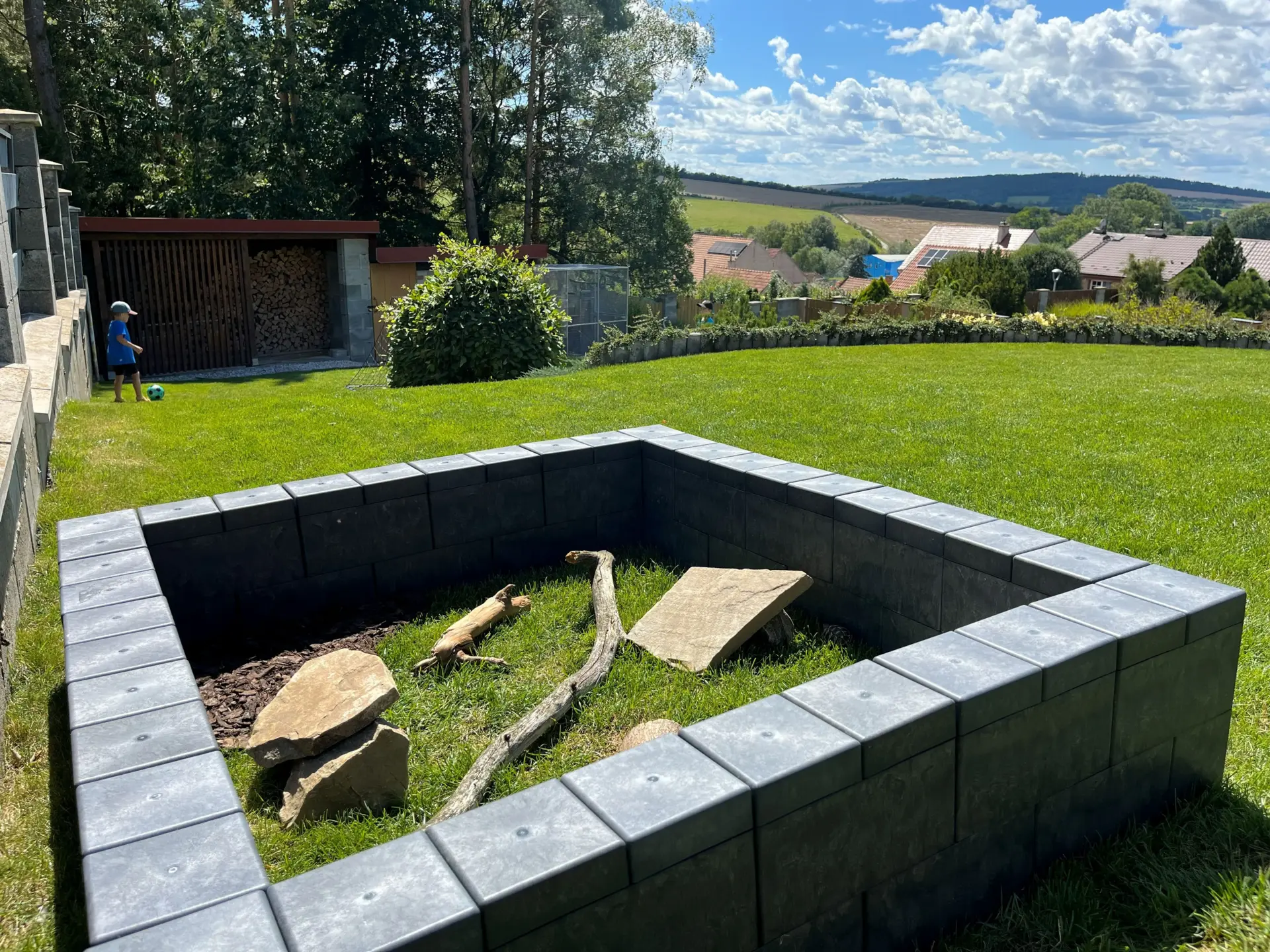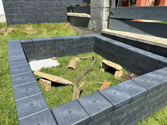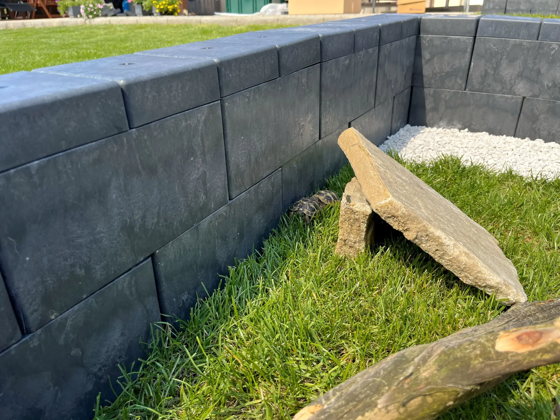 Kostky se otočí vzhůru nohama a nahoru se dají misky. Na takovouto zídku se dá sednout a pozorovat želvy jak si hrají. Dovnitř do ohrady jsme jim dali pár kamenů, ať se mají na čem vyhřívat a taky nějaké větve, aby to tam měly pěkné.