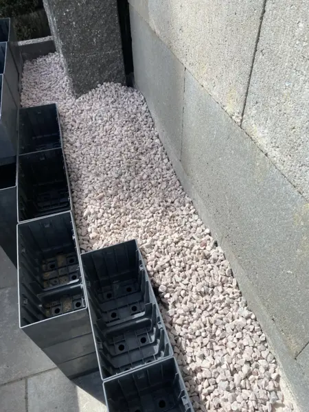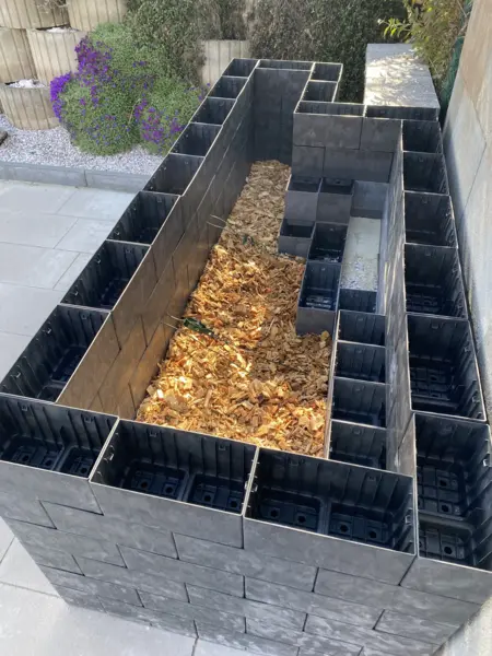 Podél zdi jsem vyskládal kostky do potřebného tvaru a prostor mezi zdí a záhonem postupně vysypal kamenivem, aby byla konstrukce stabilní. Pak už stačilo dostavět celý obvod a vznikl 2 metry dlouhý, kompaktní vyvýšený záhon, který problematické místo krásně zakryl. Záhon stojí na betonové dlažbě, na spodek jsem dal misky, který celý záhon hezky uzavřou.