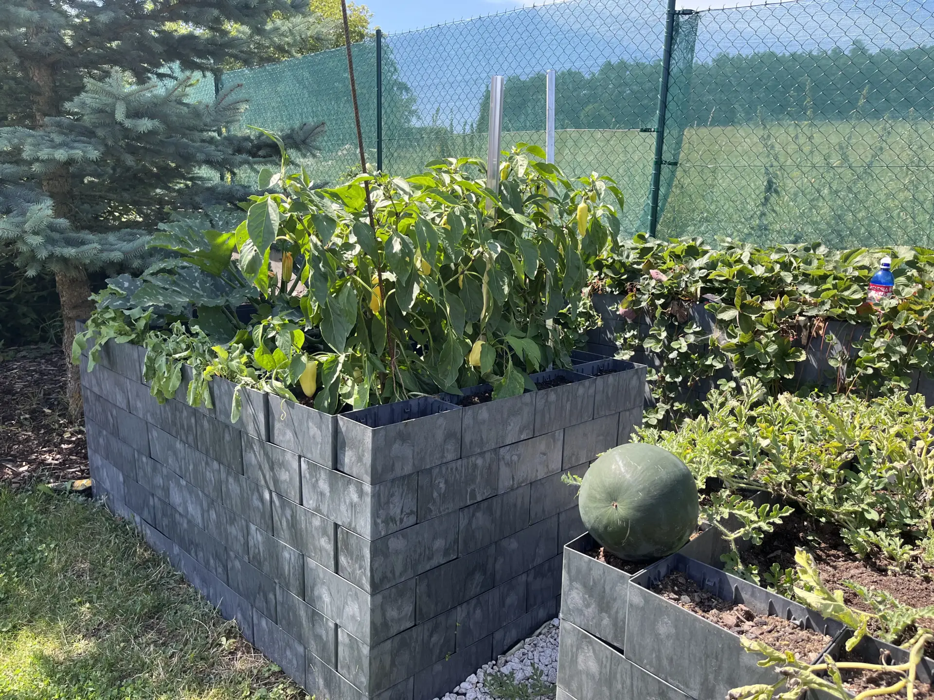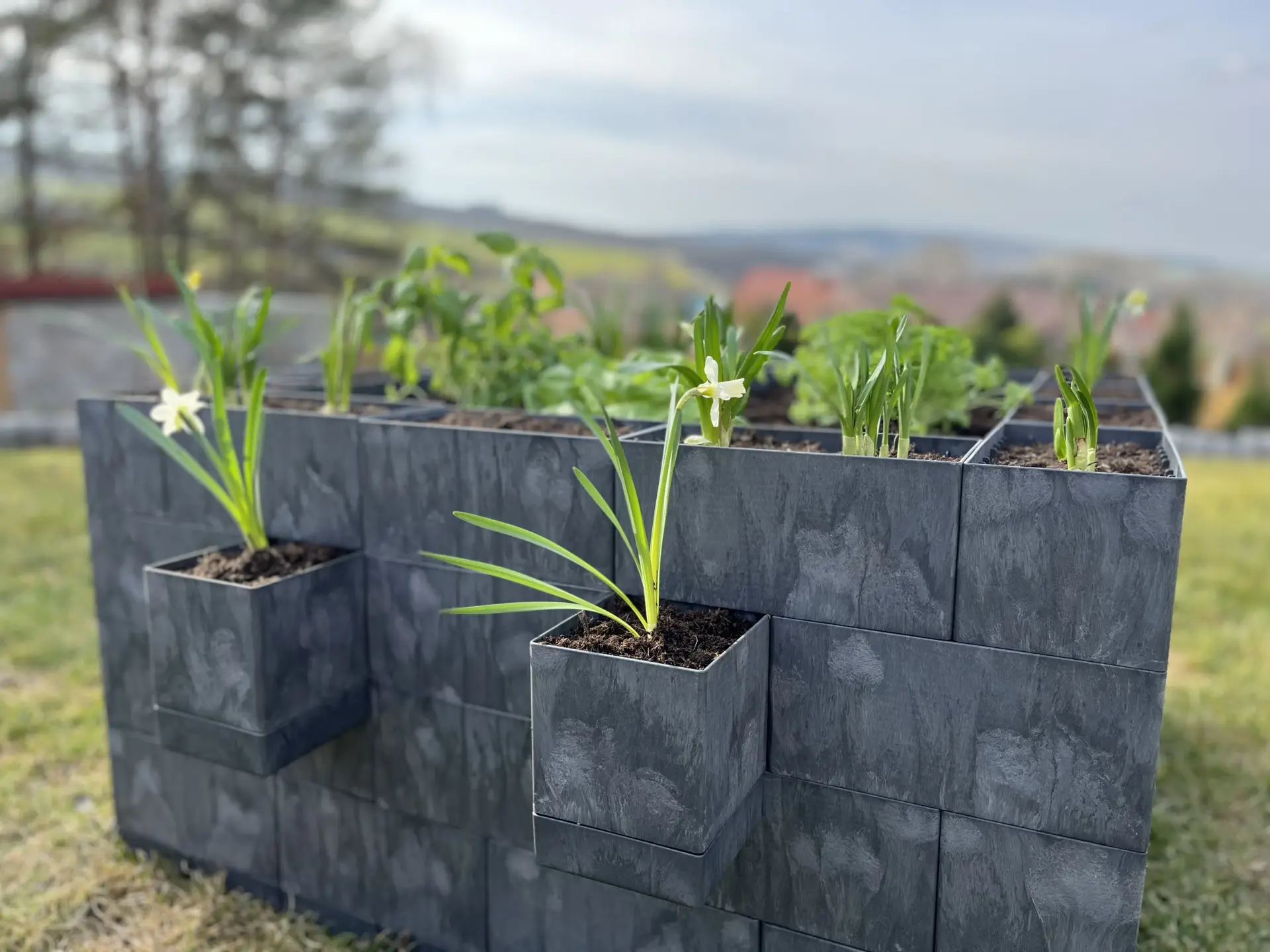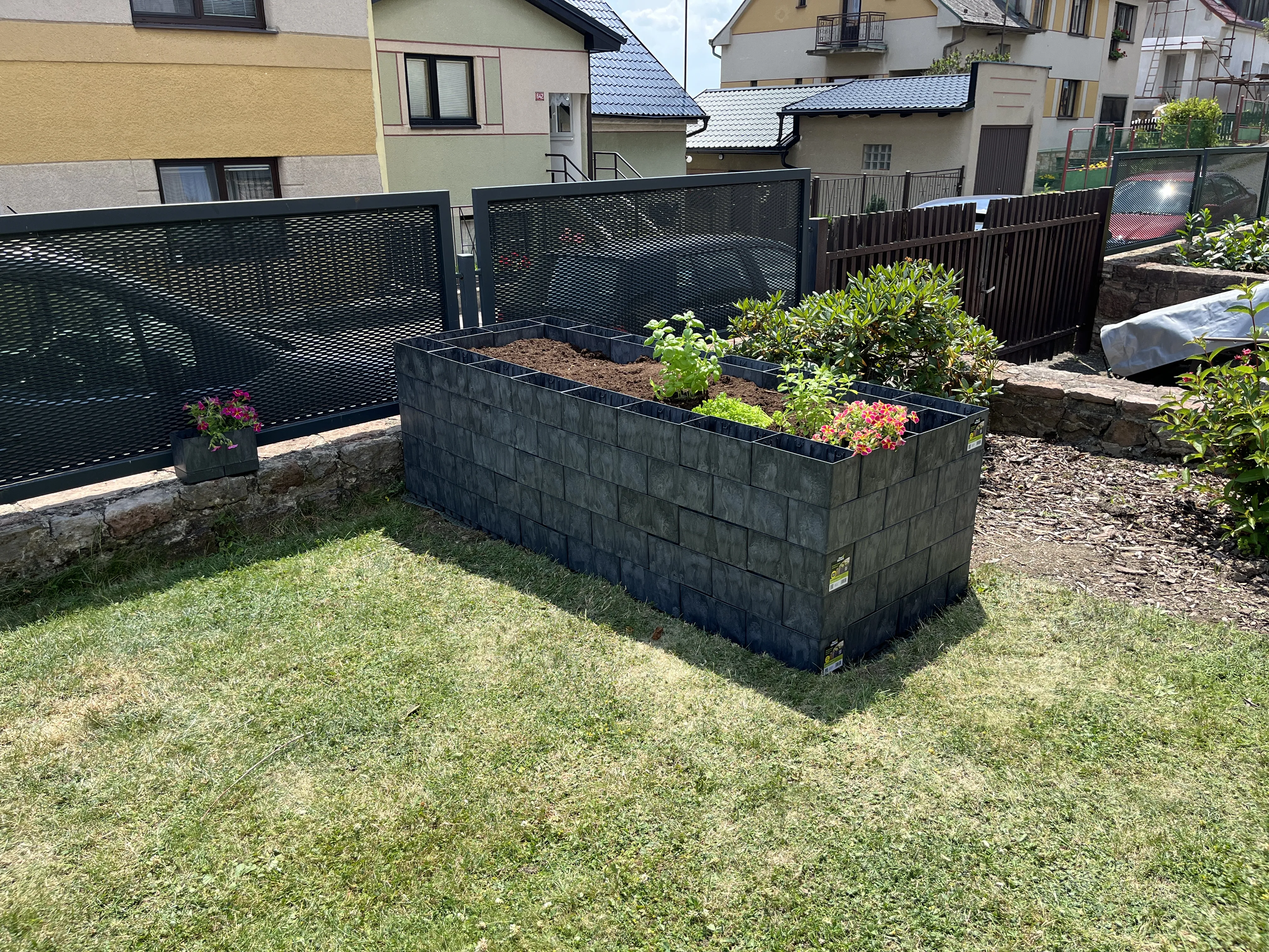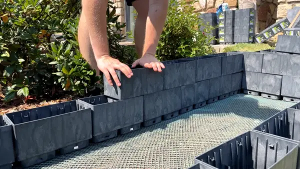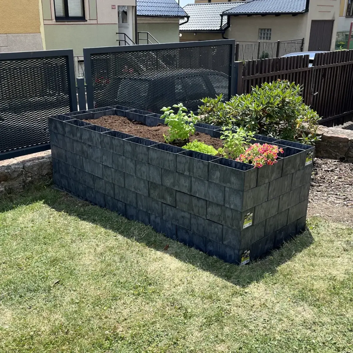 První řadu kostek jsem si pečlivě srovnal do roviny a upevnil plastovými hřeby, aby konstrukce pevně držela na místě. Jakmile byl základ hotový, pokračoval jsem dalšími řadami. To už bylo opravdu jednoduché. Kostky se do sebe jen zacvakávají a záhon roste doslova před očima.