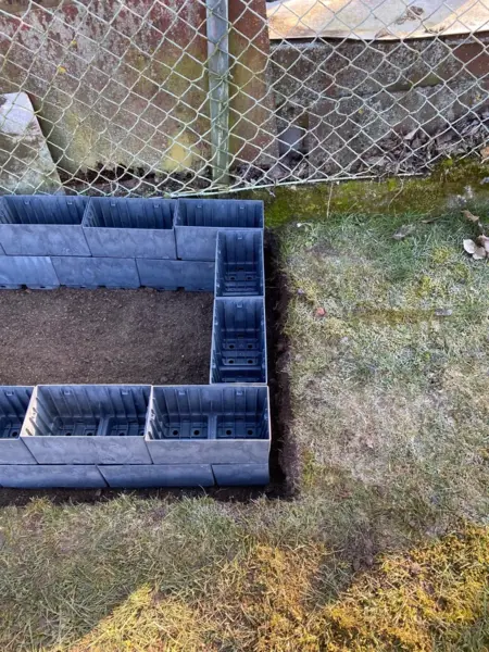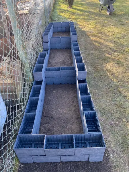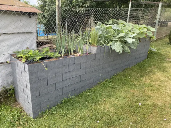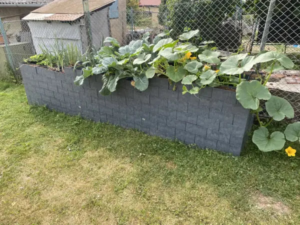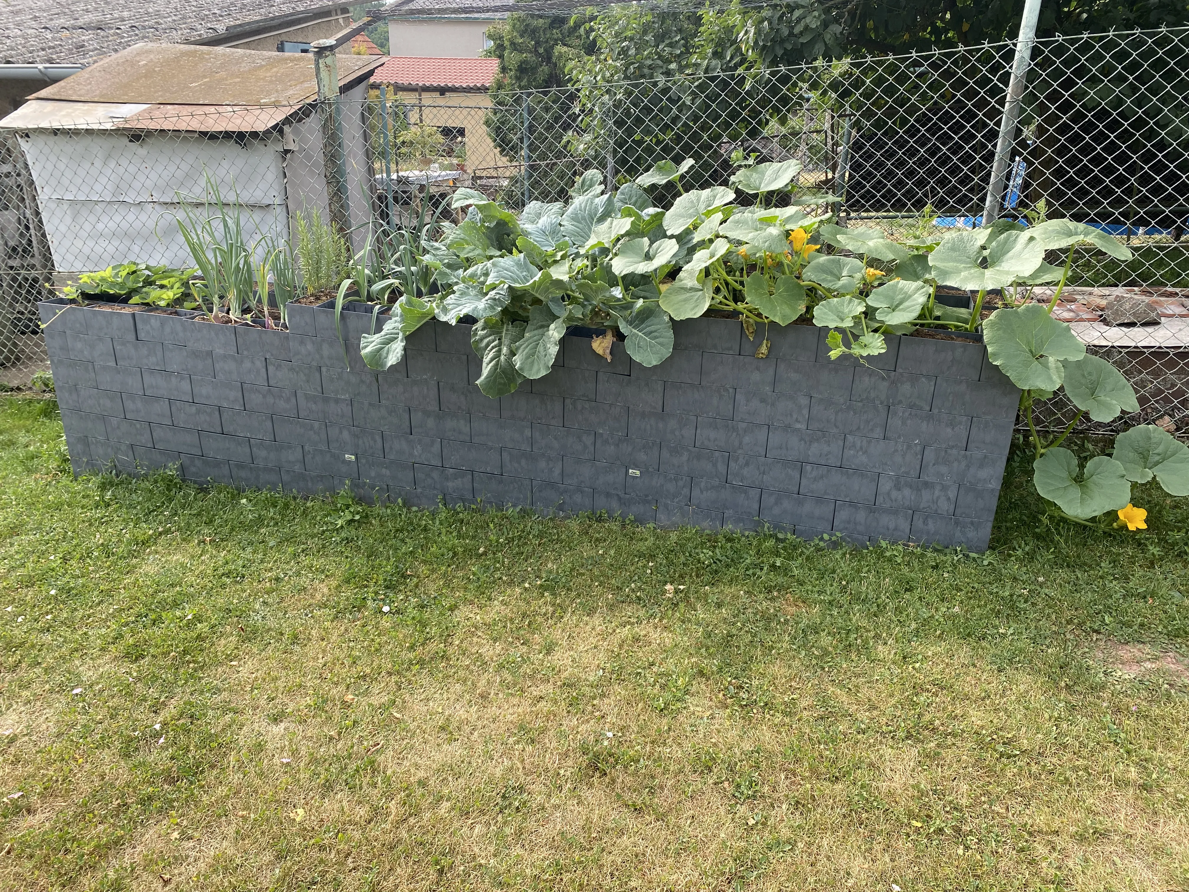 Díky stavebnici Flexi Element jsme si postavili kaskádový záhon přímo ve svahu, bez betonování a bez nutnosti odvážet dva kubíky zeminy. Stavebnici jde na sebe navazovat po jednotlivých patrech. Stačilo tedy pro každé patro srovnat povrch a odkopat jen malé množství záhonu, které se následně do záhonu vrátilo. Postavení tohoto vyvýšený záhon do svahu se nám podařilo vytvořit rovné pěstební plochy a zároveň částečně zakrýt sousedův plot i drůbež, která je za ním.