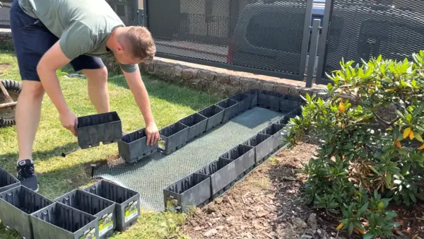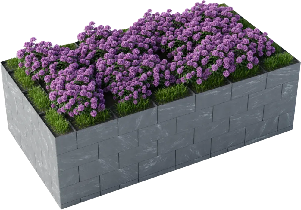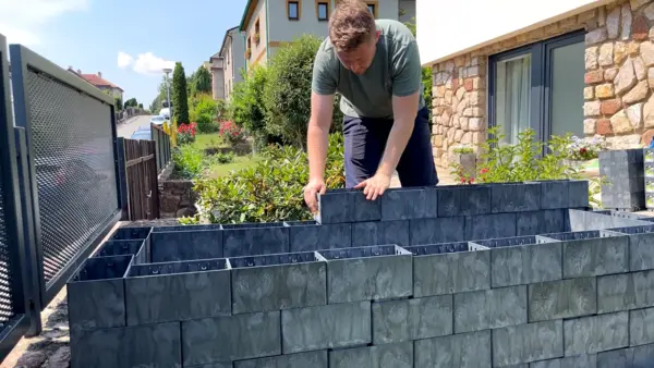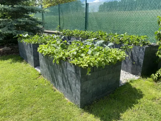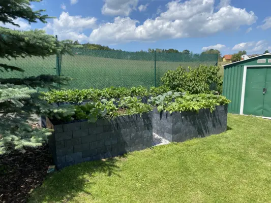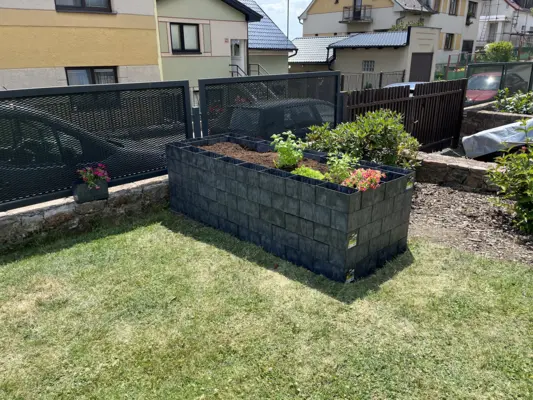 První řadu kostek jsem srovnal do roviny a upevnil plastovými hřeby, aby konstrukce pevně držela. Jakmile byl základ hotový, pokračoval jsem dalšími řadami. Kostky se do sebe jednoduše zacvakávají a záhon roste doslova před očima.