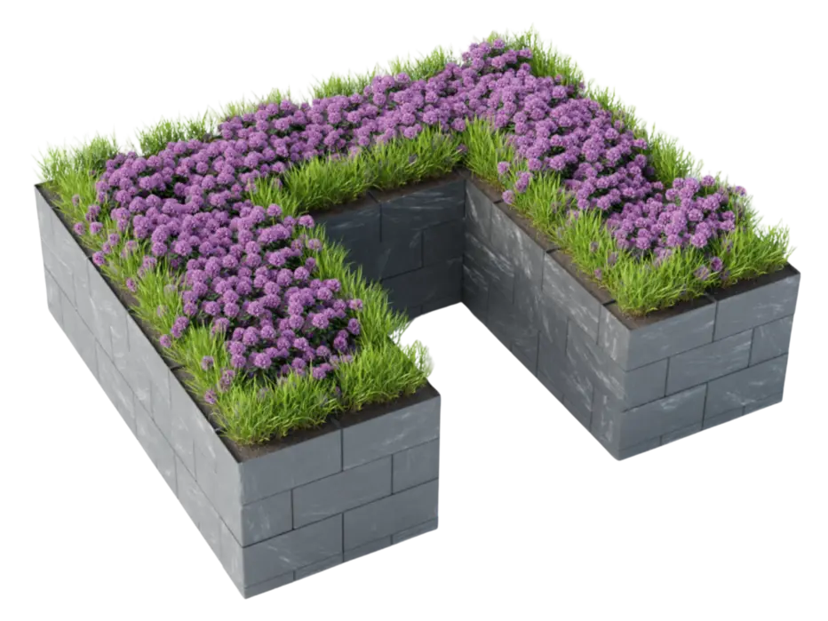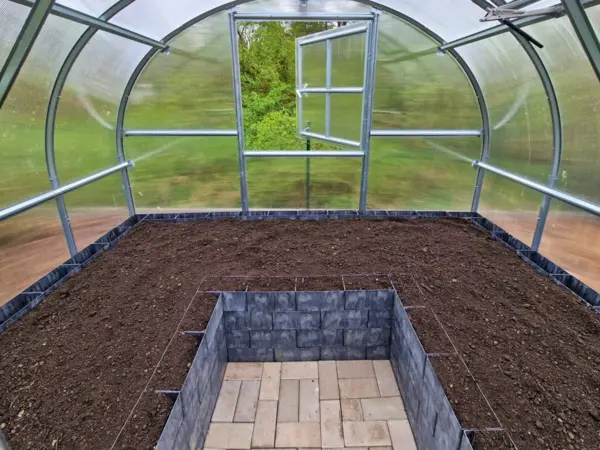 Tento tvar záhonu se osvědčuje zejména ve skleníku, kde chcete využít prostor efektivně a zároveň pohodlně. Záhon obepíná pracovní plochu a vytváří ucelenou pěstební zónu, kde máte vše na dosah bez nutnosti ohýbání. Výsledkem je ergonomické a přehledné řešení vhodné i pro seniory.