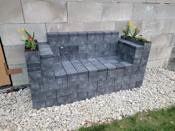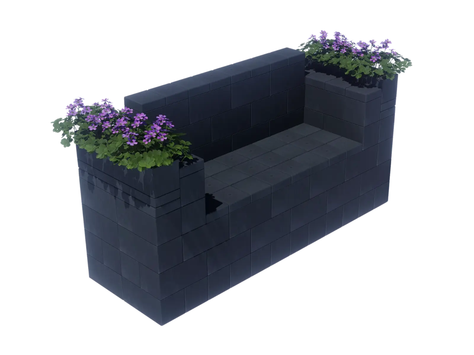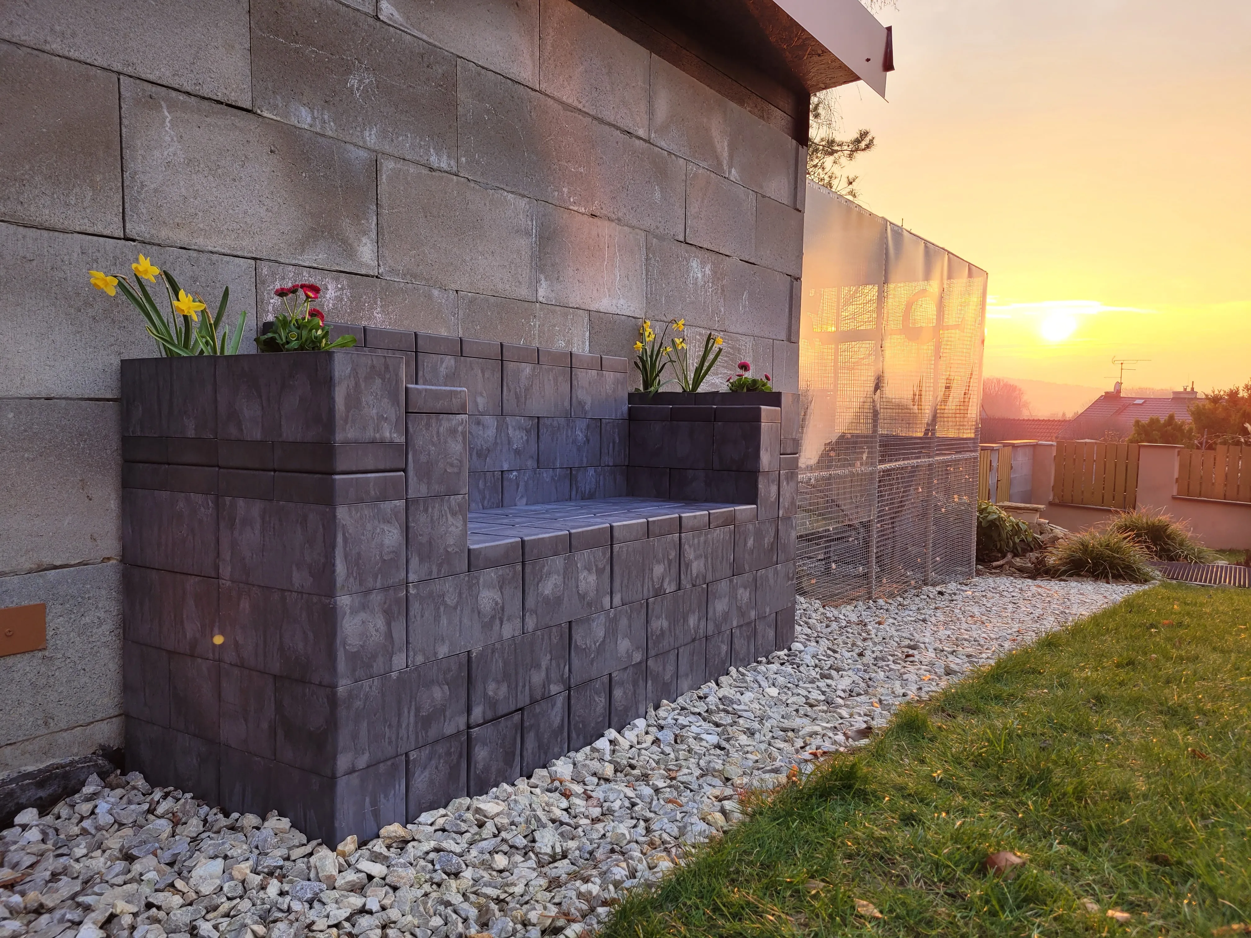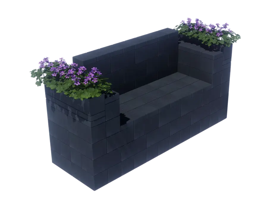 Základ lavičky je složen z kostek Flexi Element vyrobených z odolného recyklovaného plastového materiálu. Lavička tedy nehnije, nepraská a nevyžaduje žádné každoroční natírání. Jediná vase starost bude o květiny a ne o konstrukci lavičky.